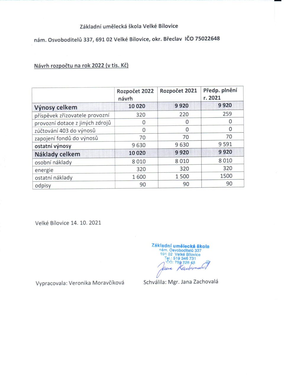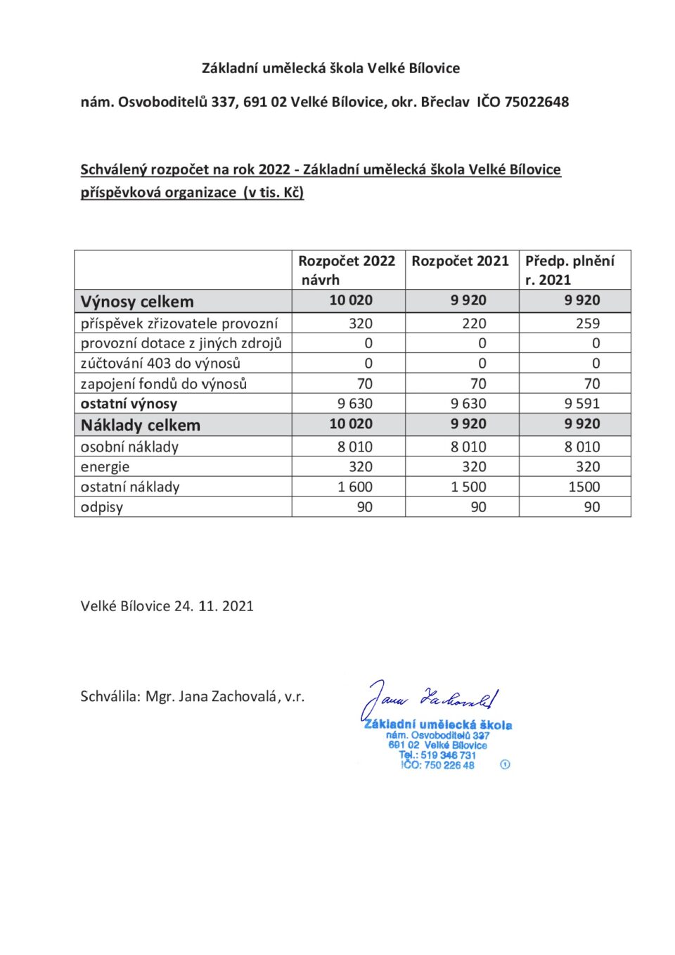 návrh rozpočtu ZUŠ Velké Bílovice na rok 2022