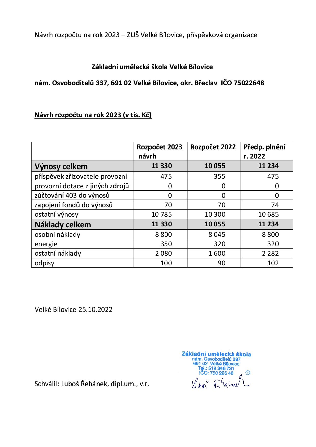 návrh rozpočtu ZUŠ Velké Bílovice na rok 2023