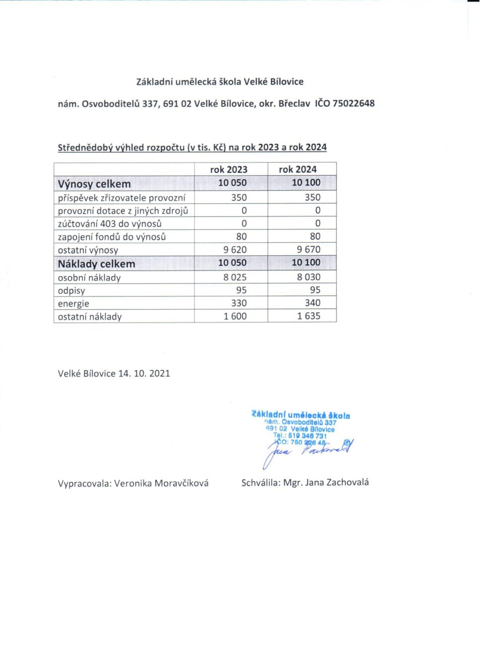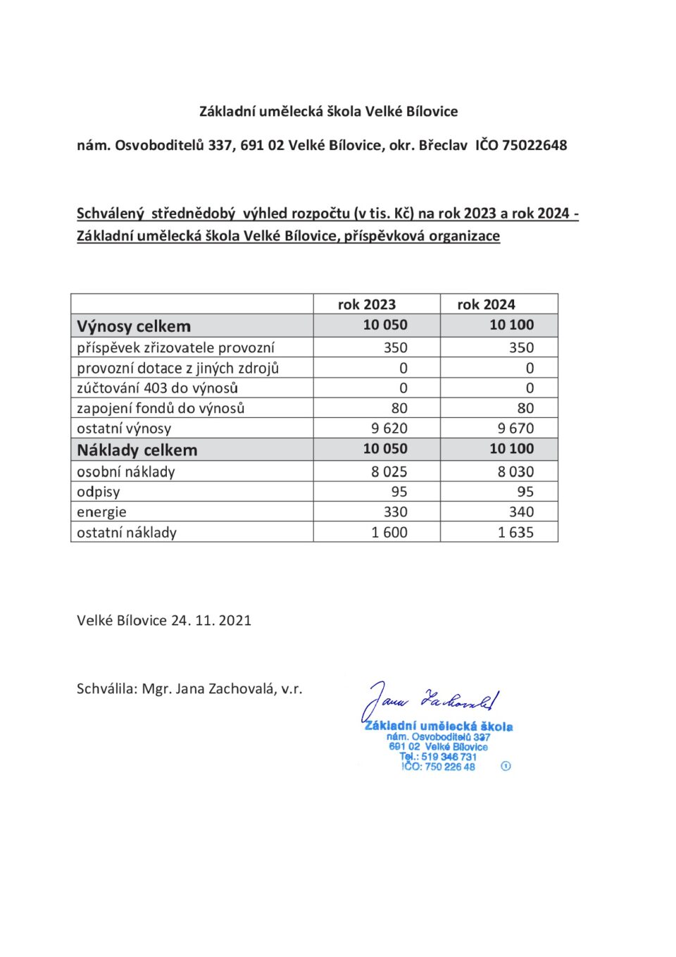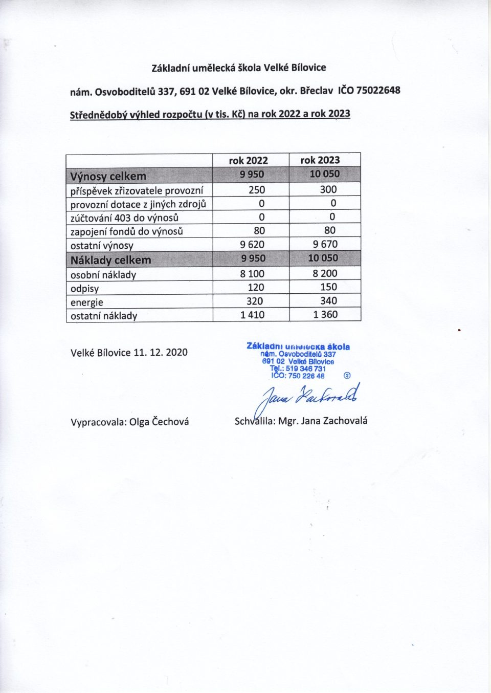 střednědobý výhled rozpočtu ZUŠ Velké Bílovice na rok 2023 a rok 2024