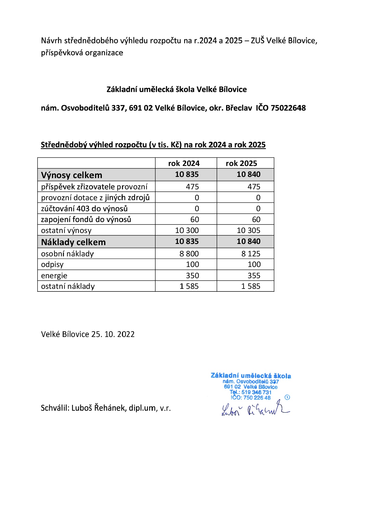 návrh střednědobého výhledu rozpočtu ZUŠ Velké Bílovice na rok 2024 a rok 2025